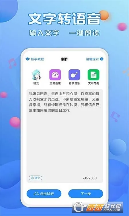 3. 功能强大:可自定义配音风格特点,能进行音频格式转换、裁剪编辑,还能添加背景音、去除杂音,带来多样混音效果,轻松处理声音文件。