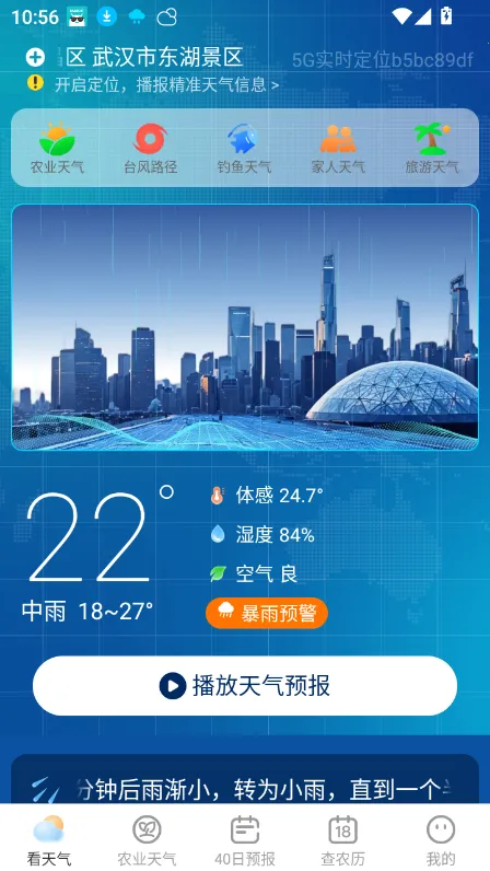 5G实时定位天气安卓版,利用5G技术秒级定位上传,结合大数据与AI算法提供个性化服务。能预警极端天气,还有智慧语音播报。涵盖家人、钓鱼等特色服务,功能多样,稳定可靠,全方位守护生活。