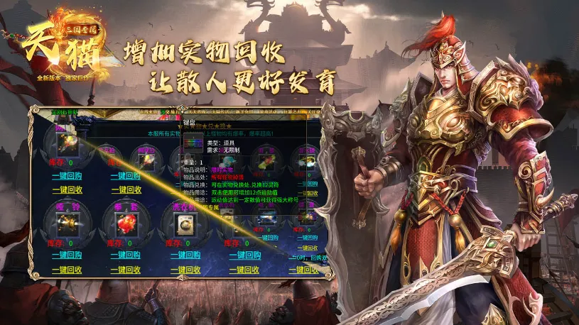 天猫三国专属是一款传奇对抗游戏,有热血皇城激斗、多重活动。百万行会混战,组队杀BOSS爆魔装。三职业可选,还有新手攻略,如每日升级、领取魔法盾等,带你感受玛法厮杀,开启专属冒险。