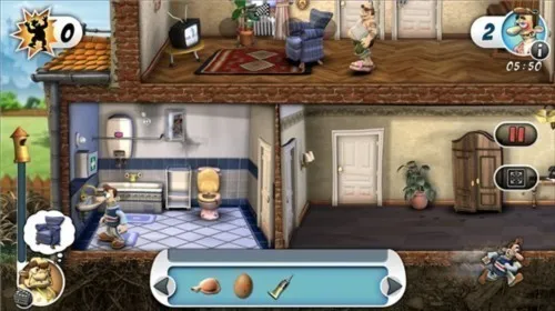 游戏画面采用精致细腻的Q版卡通风格,人物与场景十分可爱。玩法围绕潜入邻居家,利用各种道具布置陷阱展开。比如在五斗柜拿放屁坐垫,卫生间医药箱取强力胶,厨房冰箱拿鸡蛋等,然后巧妙放置,像把鸡蛋放微波炉、强力胶涂望远镜等,手动制造电视故障,将放屁坐垫放沙发,等邻居愤怒值上升即可过关。