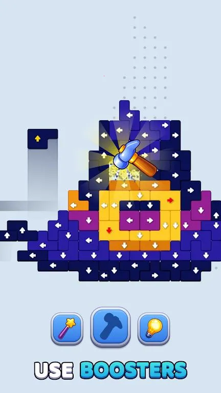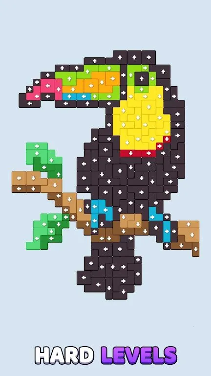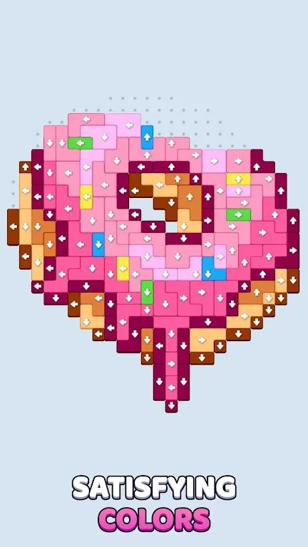 这是一款独具特色的益智游戏。游戏开始,每个关卡呈现一幅被分割成实心方块的彩色图片,方块上带有箭头指示移动方向。玩家的目标是按正确顺序点击方块使其滑出棋盘。