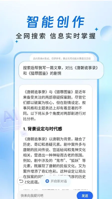 其功能亮点众多。有对话和文字输入两种模式,即便问题无厘头也认真作答。页面设置简洁,易找对话框。知识内容全面,满足不同查找需求。生成的文本可直接复制,无需担心格式。回答能逐步优化至满意。特色方面,无需下载其他翻译软件即可翻译。能激发创作灵感,推荐大数据信息,适用于工作、学习、生活等多场景。下载它就像拥有百科库,支持资源下载,以对话模式辅助工作学习,描述信息更全面。