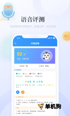 软件特色丰富。支持与机器人对话,提供沉浸式练习环境;汇聚完善题库资源;语音测评采用领先技术,提供专业纠音分析。