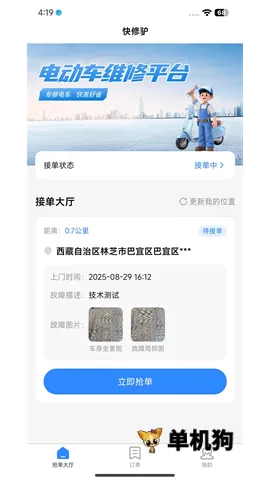 快修驴师傅端 2026 官方最新版本是一款专为电动车维修师傅打造的接单平台。它能让师傅实时获取维修服务订单,通过在线抢单或智能推送快速接单。平台提供丰富学习资料助师傅提升技能,还有数据分析帮师傅了解接单趋势。