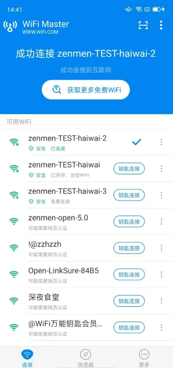 想知道哪个wifi万能钥匙好用?那就来看看吧!它能免费连接大量热点,国内500万、全球1000万热点轻松连,随时随地畅享网络。还能免费得话费流量,手机充值不花钱。能防蹭网,随时查设备,拉黑可疑的。热点覆盖全球,智能识别不安全WIFI,上网超安全。操作超方便,一键连接就行。基于云端数据库,数据超丰富,还有分享功能,大家互通有无。而且它轻快浏览不卡顿,极速搜索启动快,能拦截广告省流量,安全又有沙盒机制。有了它,不管是在家还是出门在外,都能轻松连wifi,畅快上网,看视频、刷微博、玩游戏都不在话下,真的超实用!