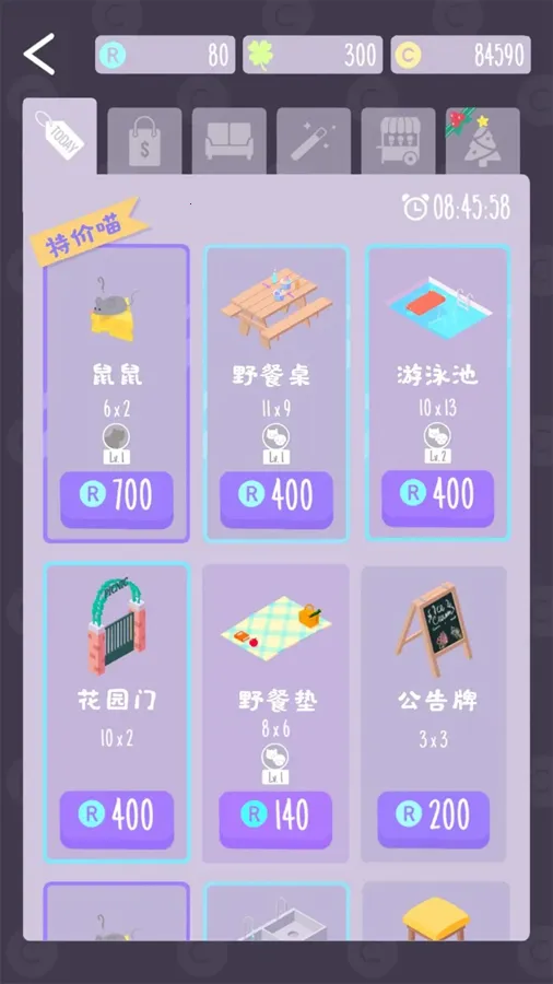 4、草坪长椅花坛和喷泉等各种趣味十足的家具和游乐设施可随意摆放、旋转和调整大小,能自由打造店铺环境。