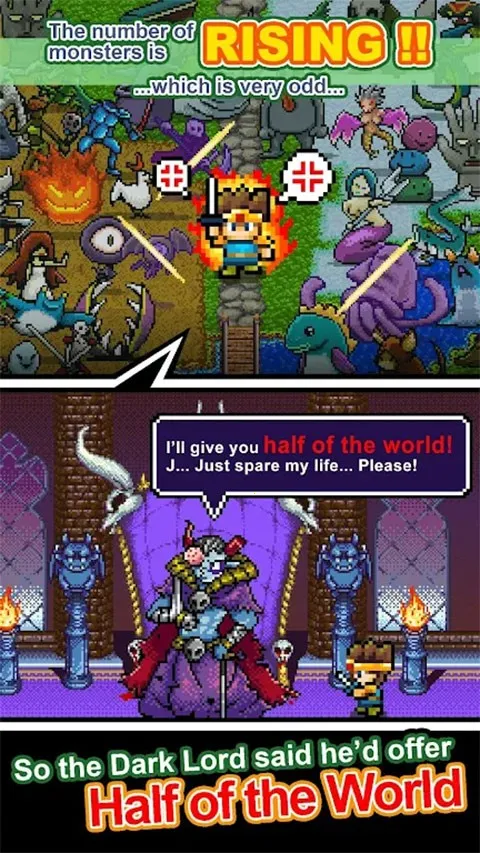 勇者明明说好分我半个世界是复古像素风冒险RPG游戏。玩家扮演勇者,在魔法与怪物世界探险,通过战斗提升能力、收集装备道具。有丰富职业技能、多样玩法,还有创新双结局等亮点,操作极简主打挂机收益,快来夺回半个世界。