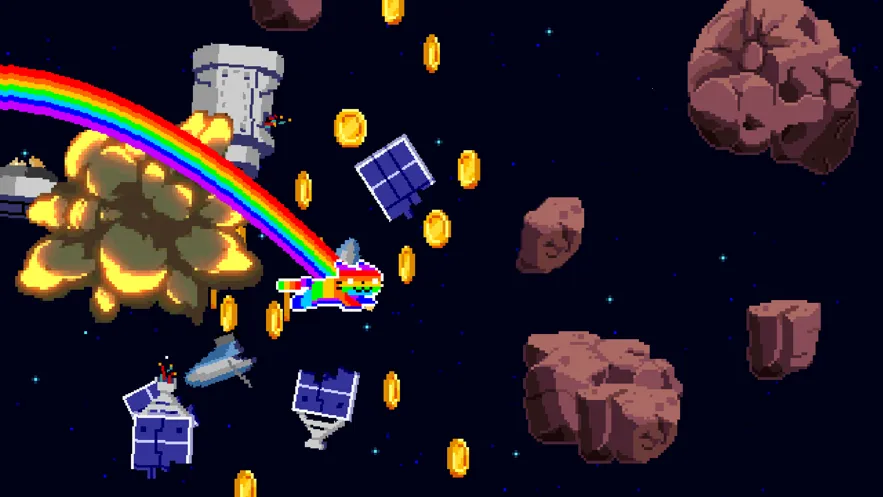 玩法上,操作简单,通过点击屏幕控制猫咪跳跃躲避障碍,还能二段跳。一路上破坏物品可得分,收集金币能解锁猫咪皮肤、服饰等装饰。途中会遇到睡着的猫猫头同伴,跳过时可唤醒使其跟随,增加破坏和金币获取,还相当于多一条命。彩虹圈是特色元素,地面彩虹圈踩中可高速跳起,悬空彩虹圈穿过能获猛冲加速。吃到彩虹蛋糕可进入彩虹猫模式,类似扑扇的小鸟,控制猫猫头吃金币,结束后能获得一只随从猫。撞到TNT会爆炸,震落物品得金币并获随从猫;打翻烟花箱可击落气球狗。