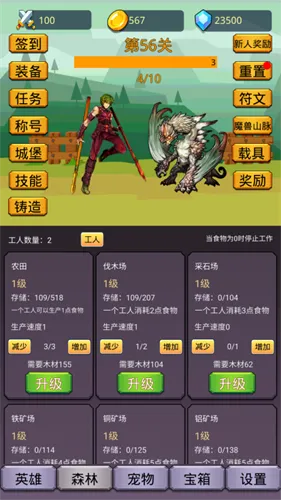 开局玩法多样,签到、刷装备、推关、重置等操作可快速积累资源。森林玩法注重合理安排工人生产,升级关键建筑与技能。宠物玩法丰富,花费钻石捕捉解锁,提升属性助力战斗。装备通过铸造获取,铁矿石推关可得,铸造等级影响品质。推关过程中,合理重置关卡,提升各项能力,基本不会卡关。总之,该版本在保留经典玩法基础上,进行了优化调整,给玩家带来更丰富精彩的英雄冒险之旅。