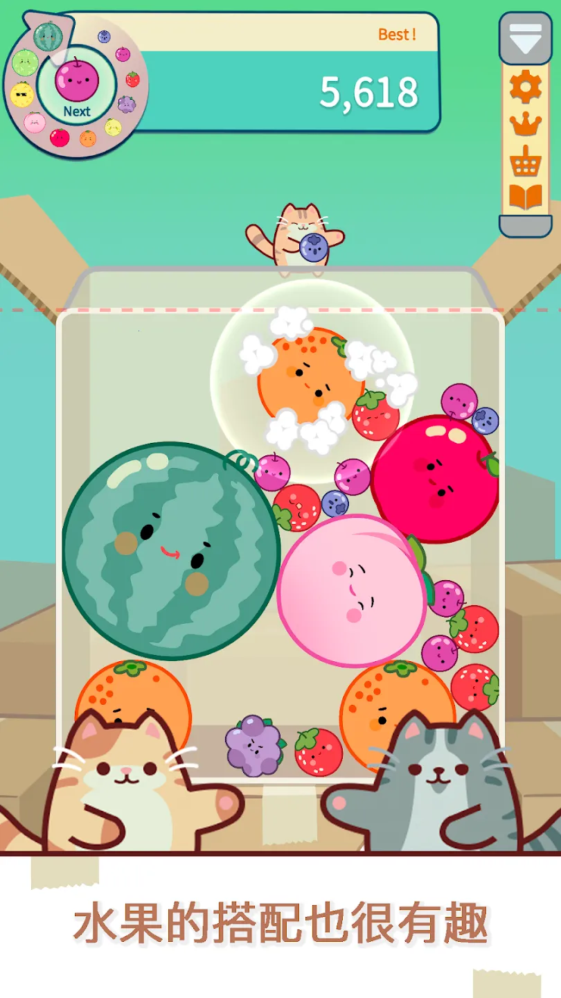 猫和西瓜的关系,就在于这款超好玩的消除合成游戏!在游戏里,你能体验欢乐多多的消除合成挑战。各种西瓜图形会不断掉落,通过合成它们来获取分数。游戏玩法简单有趣,点击水果就能进行掉落消除合成,轻松展开冒险闯关。这里有多彩类型模式,不管你是萌新还是老手,都能迅速上手,畅享合成乐趣,还能在闯关过程中拿到红包哦!游戏画面是萌系卡通风格,能让你即刻开启有趣的消除之旅。玩法多样,有趣的玩法等你来灵活参与,还有限时活动和经典消除任务,合成能得更高分数。操作灵活,完成合成还能移动,通过策略规划快速闯关。找到规律完成任务,消除合成就能拿红包,让你的空闲时间充满乐趣,趣味解压,欢乐不停!快来加入猫和西瓜,一起玩耍吧!