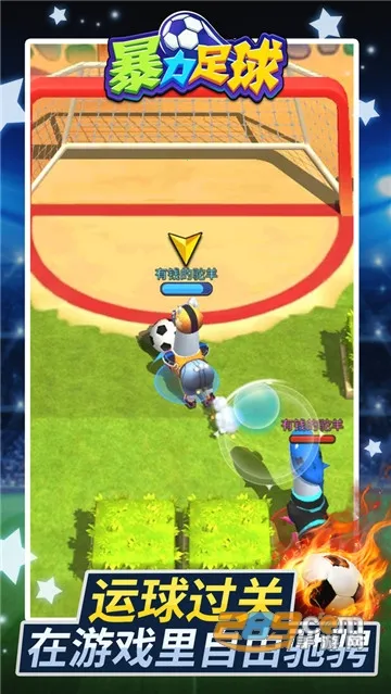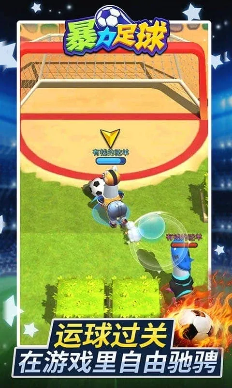 游戏画面采用卡通渲染风格,角色碰撞时的搞笑表情与爆炸特效充满无厘头乐趣。玩法上,有非对称竞技模式,玩家操控角色突破关卡射门得分,AI对手会自适应调整策略。操作简单易上手,左侧方向键控制移动,靠近足球点击“kick”射门,能量满了点击“power”释放技能。