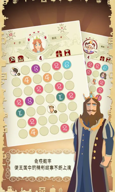 游戏画面精美,以绘本风格呈现,搭配舒缓音乐,营造出惬意氛围。操作简单易上手,通过点击空格合并相同数字推动角色进化。从基础数字开始,逐步成为王子、国王等,玩法独特。