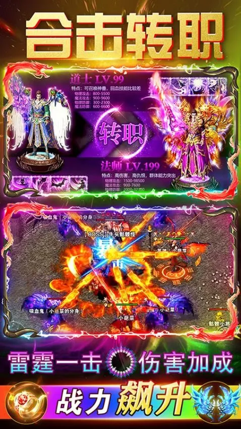 游戏福利丰厚,每日福利拉满,永久0.1折,天天送10000代金券。新手上线送豪华礼包、免费元宝等。装备元宝全靠打,不充值也能获取会员。经典职业战法道,玩法经典。还有合击和绿毒元素,新增多种神器及跨服玩法等。
