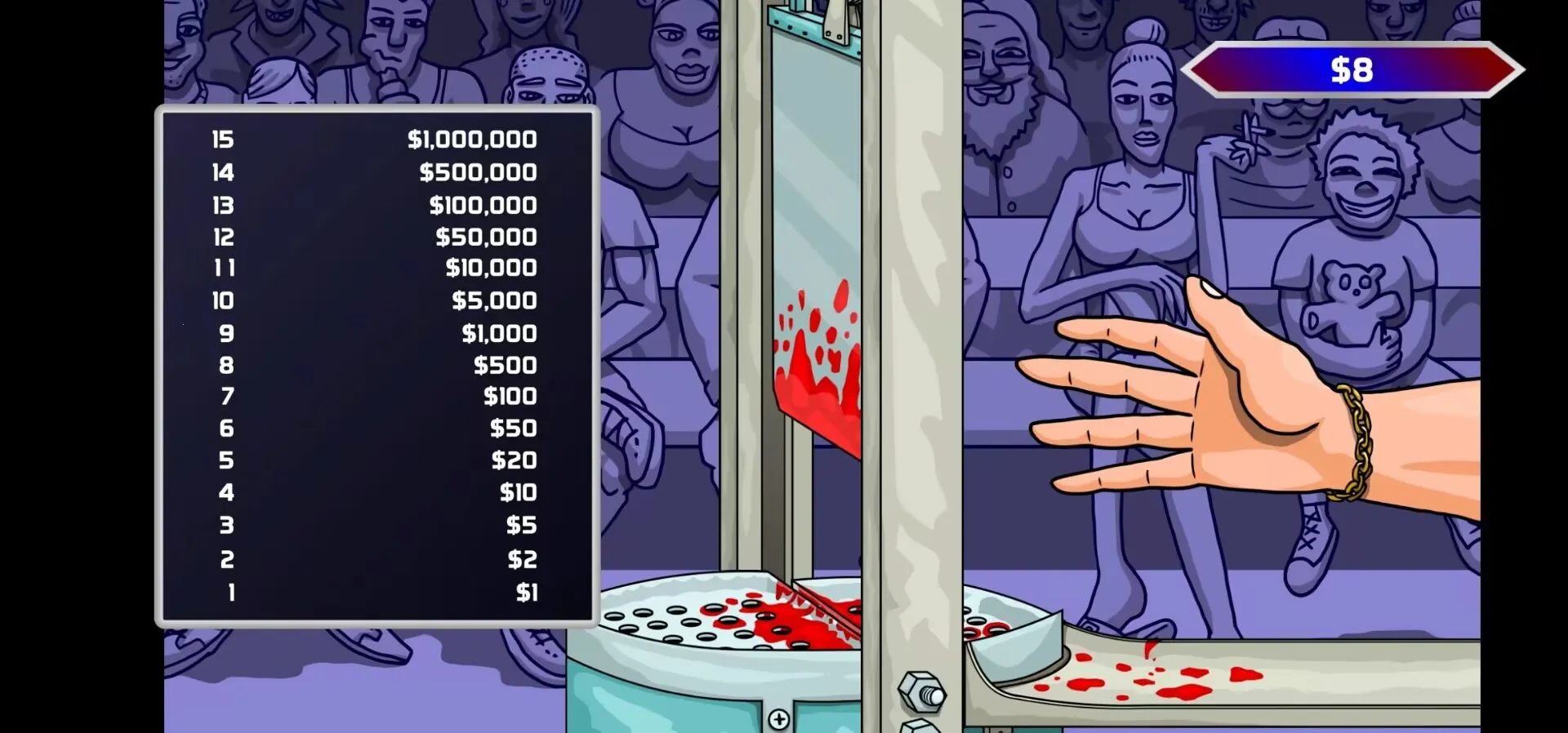 在《断手百万富翁(抢钱游戏)》中,玩家参加游戏节目争取成千万富翁,需将手放断头台间快速拿钱并及时收回,可试2次,还能玩额外回合积累现金,随着进程刀片切割速度加快,要把握时机。