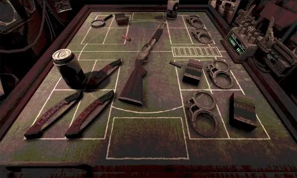 游戏玩法独特,类似俄罗斯轮盘赌,玩家和恶魔轮流转动轮盘,指针指向者开枪,枪里有实弹和虚弹,充满不确定性。这特别考验玩家的头脑、观察力与勇气,要在恶魔的威胁和谎言中侦破真相,必要时使用道具扭转对局。